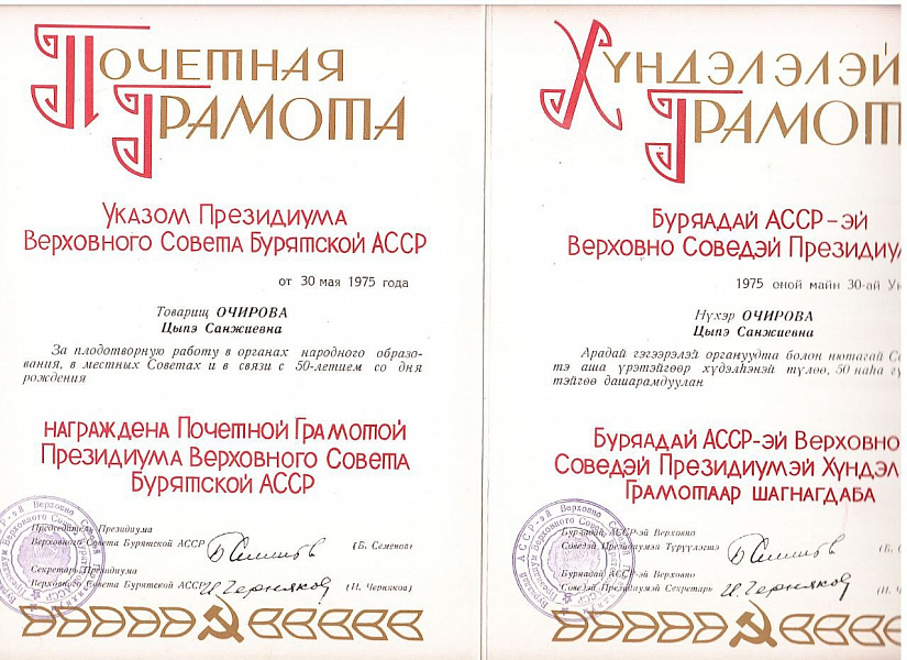 РСФСР-эй габъята багша Очирова Цэпэ Санжиевнагай 100 жэлэй мүнхэ дурасхаалда зорюулжа, Оросой Холбоото Уласай гэгээрэлэй эрхим хүдэлмэрилэгшэ Чимитова Дора Гармажаповна, Оросой Холбоото Уласай гэгээрэлэй эрхим хүдэлмэрилэгшэ Цыренова Валентина Доржиевна, Хойтобэеын дунда һургуулиин захирал Бадмаев Владимир Михайлович, Олониитын ажал ябуулагша Цыренов Цырен Цыренович, Оросой Холбоото Уласай гэгээрэлэй эрхим хүдэлмэрилэгшэ Гончикова Санжитма Аюровна, 28-дахи элүүржүүлгын һургуулиин захиралай орлогшо, Болбосоролой хүндэтэ ажалшан Цыренжапова Любовь Бадмацыреновна.